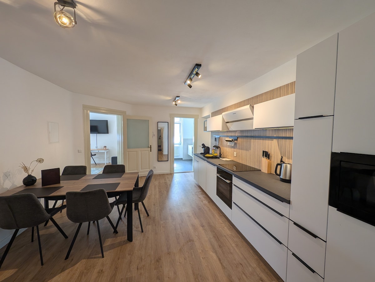 30qm Wohnung in saniertem Zweifamilienhaus Eingangsbereich Hauptraum 1,60m Bett, Couch (mit Schlaffunktion in 1,30m Breite), Esstisch als Anrichte ausgeführt Küche voll ausgestattet (Premium Geräte, Kaffee, Tee, Trinkschoki for free) gegenüber Doppel-Waschtisch links davon Eingang zur offenen Regen-Dusche rechts davon Toilette (abschließbare Tür) el. Rolläden Hauptraum & Klo Plissees an allen Fenstern Fahrzeug(e) kann direkt vorm Grundstück geparkt werden (Sackgasse)! Hof noch nicht saniert