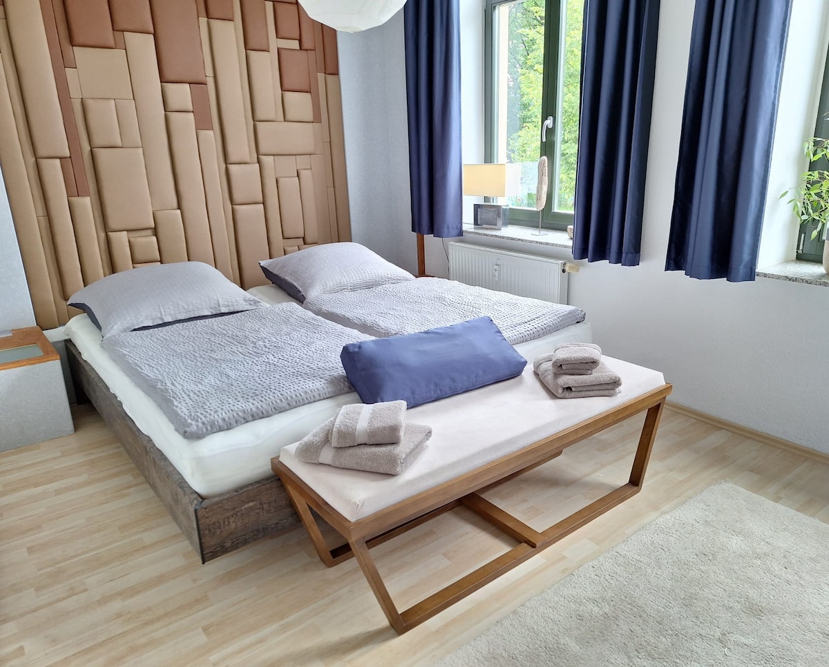 Eine individuelle Ferienwohnung – einfach zum Wohl fühlen Die Wohnung im Erdgeschoss des Wohnhauses von Andrea Marofke verbindet den Charme eines älteren Hauses mit modernem Wohnkomfort. Große Fenster lassen viel Licht in das geräumige Wohnzimmer. Ausgestattet mit vielen Kunstwerken in der Wohnung und mit großem Künstlergarten. Sehr ruhige Stadtrandlage im schönen Vogtland, am Morgen wird man durch Vogelgezwitscher geweckt. Wir sind Provinz und weltoffen ☀️