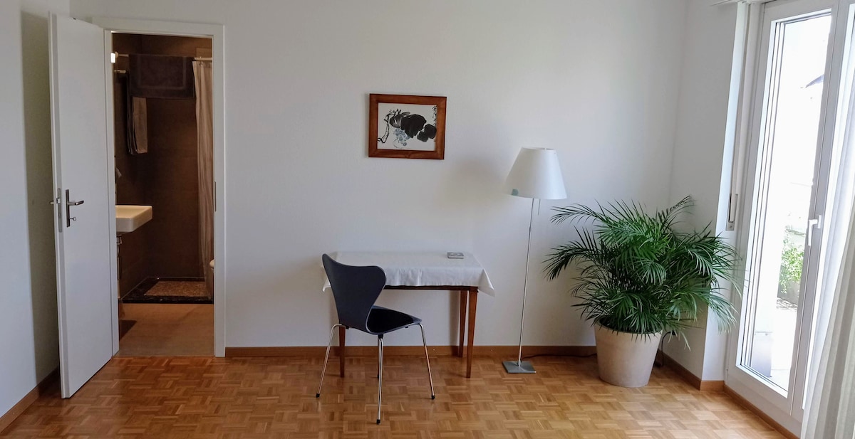 Suite bestehend aus Schlafzimmer, Living Room, Garderobe, Badezimmer. Fühle dich wohl in den geschmackvoll möblierten Zimmern, hell und mit Blick in den Garten. Tisch, Gäste WiFi, Leseecke. Kaffee, Tee, Wasser. Privater Gästeeingang und Gartensitzplatz zur alleinigen Nutzung. Bevorzugte ruhige Wohnlage, im Grünen auf dem Bruderholz. Beste ÖV/Anbindung zu St. Jakob, Bahnhof SBB, Kantonsspital Bruderholz, Autobahn. Aussicht auf Basel und Umgebung in Gehdistanz.