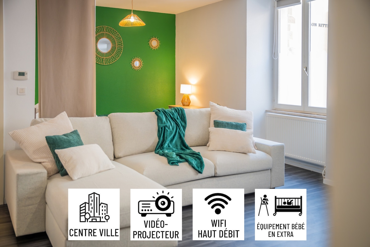 Studio Cinéma avec Vidéoprojecteur - Expérience Immersive à Mulhouse Plongez dans une expérience unique en séjournant dans ce studio sur le thème du cinéma, pensé pour vous offrir confort, détente et immersion totale. Dès votre arrivée, laissez-vous séduire par l’ambiance cinématographique et profitez d’un écran géant avec vidéoprojecteur, idéal pour des soirées films mémorables.