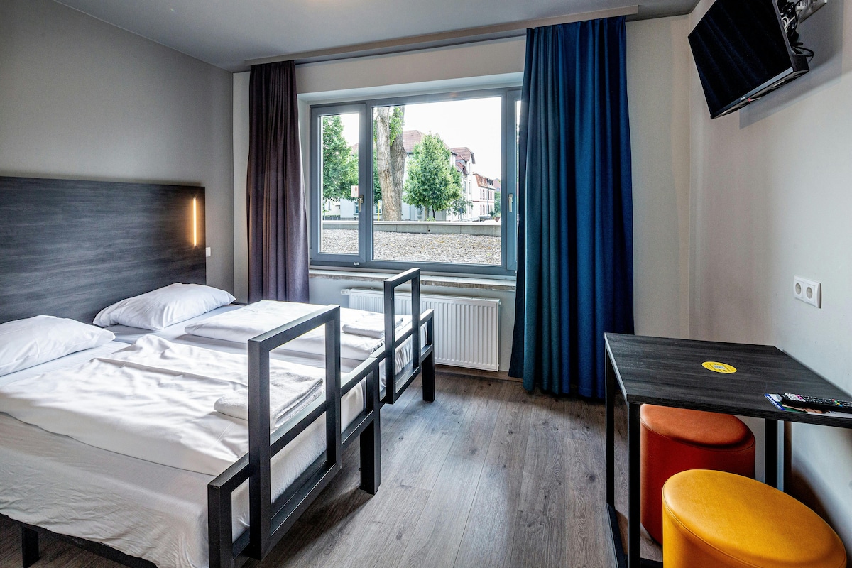 Our Twin Room offers 15 m² of comfort with two twin beds, a cozy sitting area, and heating. The private bathroom includes eco-friendly toiletries, a hair dryer, and fresh towels. Enjoy a flat-screen TV with premium cable, free Wi-Fi, and an in-room safe. The room is pet-friendly and family-friendly, with a complimentary crib and an iron available on request. Note: City tax is collected at check-in.