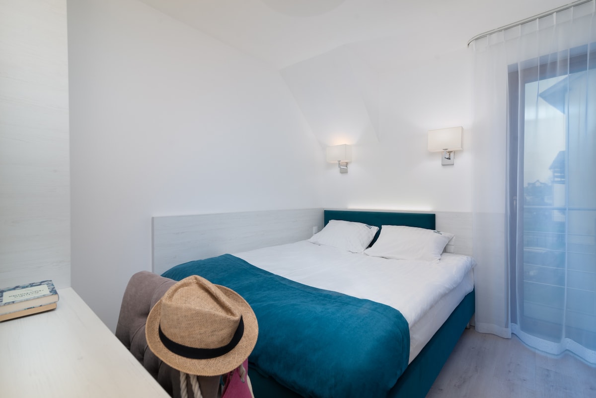 Aqua Przystań 80 apartment is located in Rumia, right by the Tricity area. It’s a perfect base for trips to the Hel Peninsula, Gdynia, Sopot, Rewa, Mechelinki, or Reda Aquapark. The apartment, styled in a seaside theme, impresses with its peaceful aesthetics and marine accents. A decorative fireplace creates a cosy feel, and a modern keyless entry system provides comfort and security. Guests have access to fast Wi-Fi, free garage parking, and an additional outdoor parking spot.