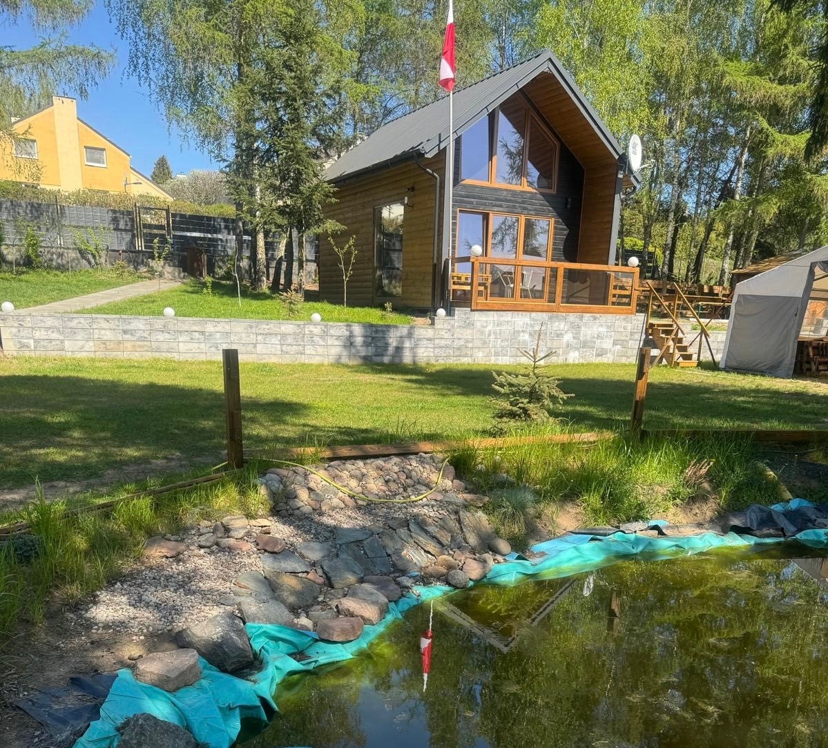 Kameralny 30 metrowy domek na ogrodzonej działce. W domku na otwartej przestrzeni wydzielono część wypoczynkowo- sypialnianą, kuchnię, jadalnię oraz łazienkę. Domek jest ogrzewany kominkiem oraz klimatyzacją. Wielkim atutem są kaskadowo ułożone tarasy z których widok rozpościera się na jezioro. Przy domu znajduje się jacuzzi oraz balia ogrodowa. Na ogrodzie wyodrębniono strefę dla dzieci- plac zabaw, trampolinę, huśtawki oraz zjeżdżalnię. Odległości: jeziora - 50 metrów, lasu 100 metrów.