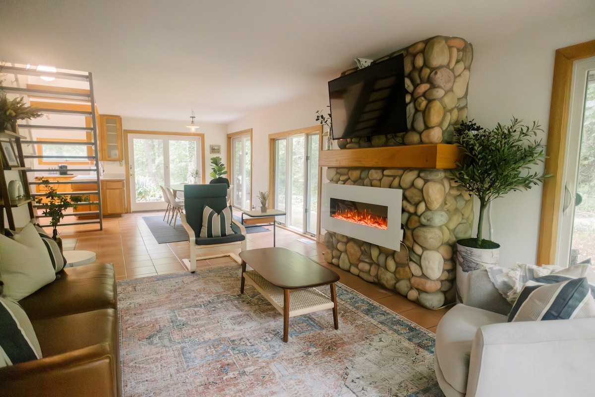 Follow a wooded path to a secluded mid-century modern cottage constructed of stone and wood reclaimed wood from a historic St Joe's rollercoaster. Retro pink ceramic tiles line an open-plan main floor surrounded by sliding doors. You will be surrounded by the great outdoors while sitting cozy inside by our electric fireplace. Located about 10 minutes south of downtown St. Joe, our Idyllic A-frame is a perfect location for the escape to SW Michigan that you've been dreaming about.