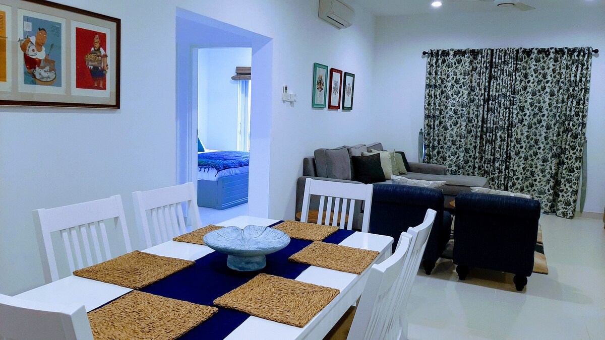 Sheer elegance apartment, ideal for four guests. step out onto your private garden patio with a serene plunge pool .Maintained to the highest standards, it boasts a cozy living room, two air-conditioned bedrooms, and a fully equipped kitchen. A proper bathroom and toilet.The apartment is specious and clean .Explore the shared backyard garden featuring another inviting swimming pool. simply decorated apartment villa .Walking distance to the beautiful beach.Ideal for a couple or a family