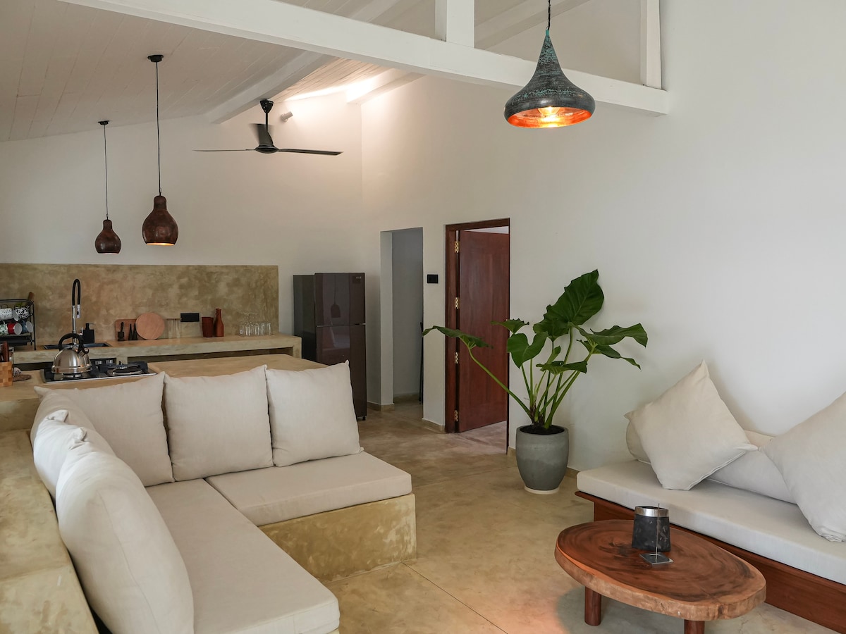 Enjoy your stay at our private beach front home located in the heart southern mirissa. This spacious duplex is perfect for a traveling friends or family looking for a peaceful stay. Space The unit comes 2 bedrooms 2 bathrooms sofa bed and fully furnished modern kitchen. The spacious dining area is adjacent with a large table seating for six. The grey wall sync with peacock blue cushions thus creating a cozy atmosphere in the living area where you can spend plenty of quality times.