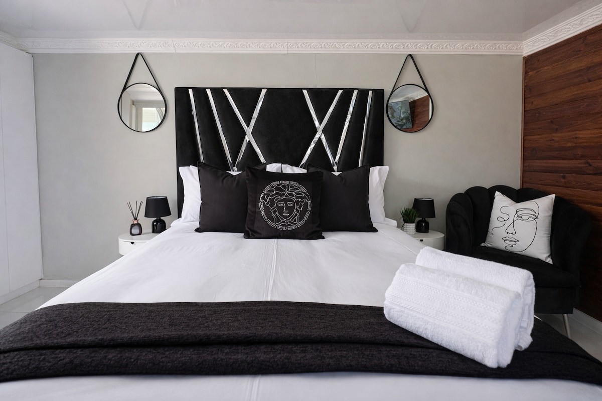 The Luxury Studio features a queen-sized bed and an en-suite bathroom. Enjoy Wi-Fi, air-conditioning, and a smart TV with DStv and Netflix. A well-equipped kitchenette with a gas burner, microwave, and fridge adds convenience to your stay.