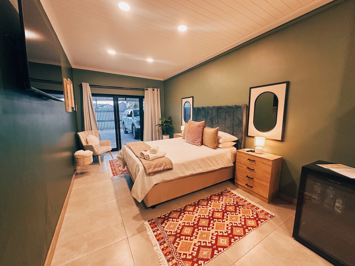 The Luxury Studio features a queen-sized bed and an en-suite bathroom. Enjoy Wi-Fi, air-conditioning, and a smart TV with DStv and Netflix. A well-equipped kitchenette with a gas burner, microwave, and fridge adds convenience to your stay.