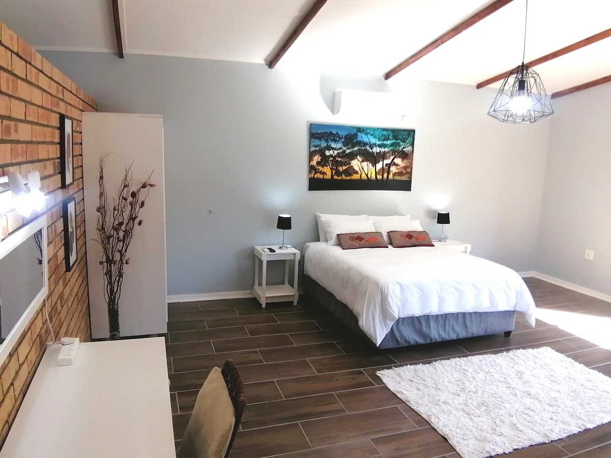 Welcome to your unique, modern and stylish apartment in Welkom, crafted from a transformed garage offering you a private and comfortable stay. This thoughtfully designed open-plan studio is perfect for relaxing, working, or as a home base. There's a double bed, a fully equipped kitchen with a gas stove and air fryer, a living area with a TV and Open View, a workspace and Wi-Fi. Self-check-in with a lockbox and use a dedicated carport.
