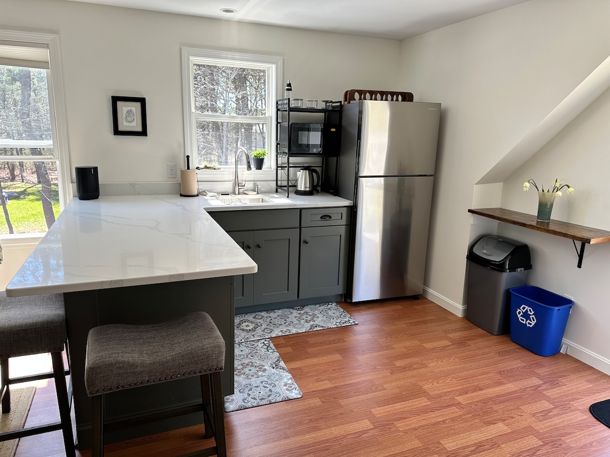 Unwind in this calm, stylish studio oasis. Stroll to Mass Audubon or bike just 1.3 miles along the trail next to our development to reach Marconi Beach. Enjoy local restaurants, a flea market, and Wellfleet Drive just 0.9 miles away. A small market on the Eastham-Wellfleet line offers essentials, sandwiches, and drinks. With owners on-site, the space features a private entrance, a deck with an electric grill, and an outdoor solar shower for rinsing off after a sunny day.