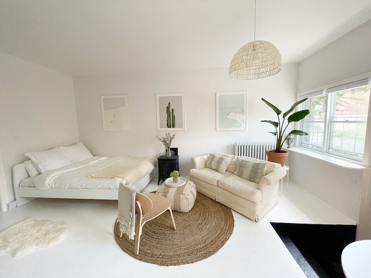 Ideal for Single Person or Couple - Studio Unit, Entire 280 sq ft Coach House on Heritage Property in Beautiful and Mature Forest Heights in Kitchener close to ExpressWay and Shopping, luscious backyard with trees and vegetation, includes heat, hydro, water, WIFI, Parking for one, fully furnished with TV included, very private, recently fully renovated with new Quartz countertops, high gloss white custom kitchen, new flooring, paint, windows, AC, Heating, Ceiling Fan, IKEA Furniture