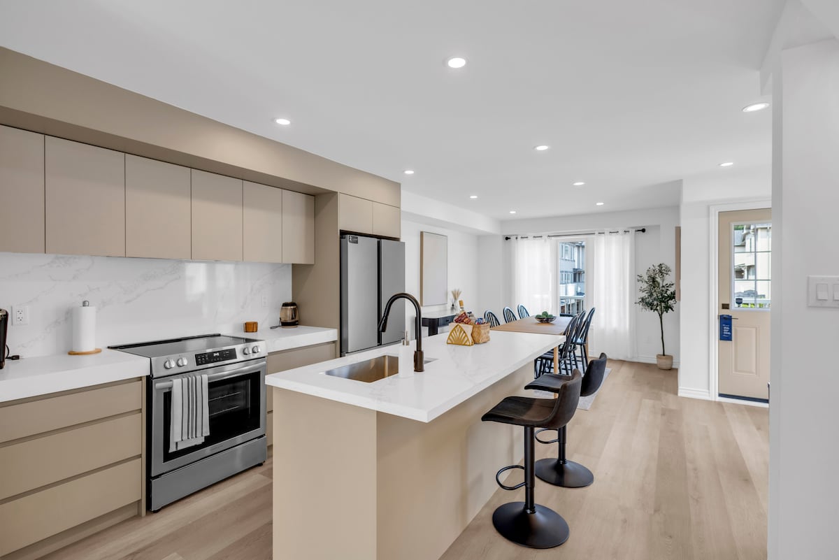 Feel at home in this spacious and serene 3-bedroom townhouse. Each bedroom features a personal desk for studying or remote work. Enjoy an open-concept kitchen and a large living room area. Located steps from trails and minutes away from supermarkets, downtown, and restaurants. Enter the correct number of guests when booking. The price increases after 2 guests. For 2 guests: You will have access to two bedrooms (the main room and the blue one. The third bedroom (yellow room) will be locked.