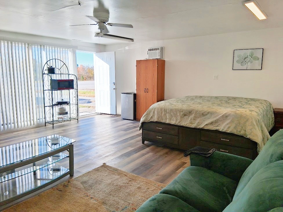 Sleep peacefully in this 600 square foot fully furnished guest apartment located off I-70 frontage in Oak Grove on 18 acres with 2 ponds and rolling pasture. A gravel drive leads to the property where you'll have a concrete parking place and a step-free, pavestone walkway to the front door of the apartment. Rest soundly on a queen size Tuft n Needle mattress in a bedroom with room darkening shades and various pillows to satisfy your comfort. Fully equipped kitchen, laundry room, 2 smart TVs.