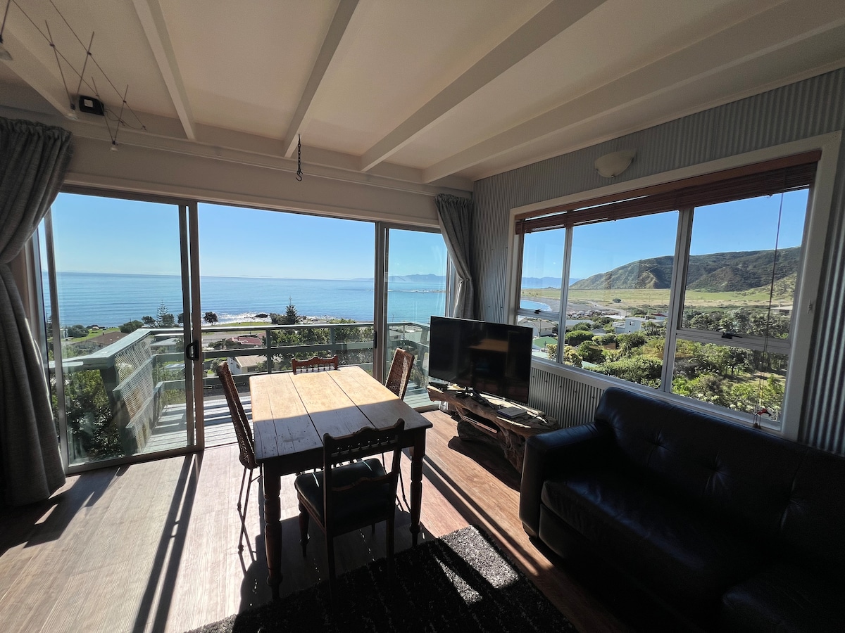 Private, comfortable home on the ocean with quick and easy access to Wellington city and the Airport. This two-bedroom open-plan home enjoys panoramic views of the coast. Full kitchen, hardwood floors, double glazing, radiator central heating and stylish bathroom with bath. The best surf and swimming beaches within 5 mins walk and in summer, Dolphins dance at your window. Experience the drama of the Great Southern Ocean, one of the best examples of NZ's raw, natural beauty.