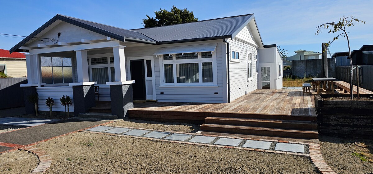 Make some wonderful family memories at our renovated bach. With modern whiteware and great indoor/outdoor flow our bach makes for easy living! It's situated on the beach front in the sand dunes, only 50 meters from the shop and park, and a short walk on the beach to the north "surf club flag area". Fun walks in either direction with reefs at each end of the beach for fishing or for fossicking with the kids at low tide for interesting crabs and shellfish. Enjoy our holiday bach!
