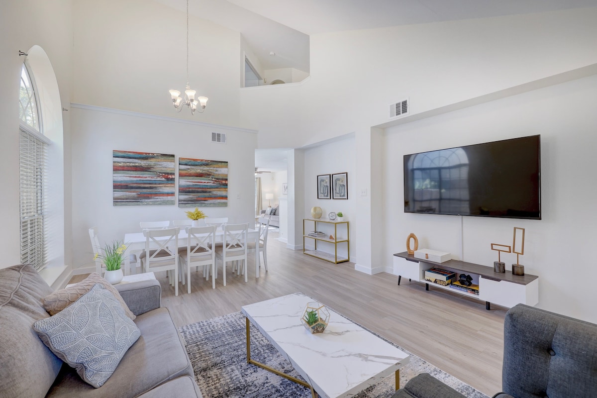 8 mins Drive to Domain. Smart, comfortably, newly renovated 3B2B home features beautiful new modern furniture, , 65"(55") smart TV, blue tooth speaker built in ceiling fan, king size bed, walk in shower with rain shower head, smart décor with built in USB chargers, , a gorgeous covered patio, high speed WiFi, working desks with 24" monitor. The perfect place for families w/ kids or business people looking for the perfect home away from home.