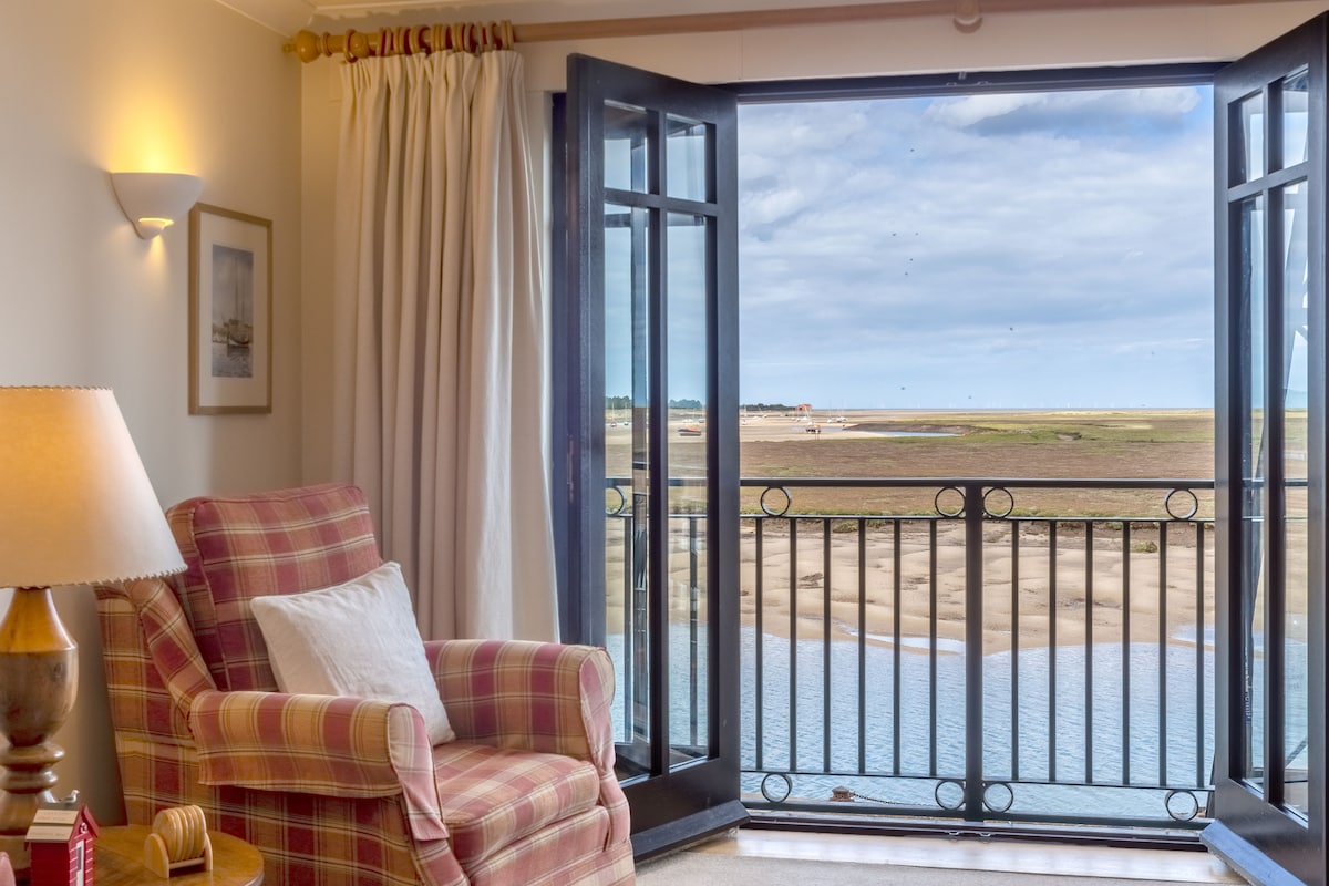 A two bedroom corner apartment within the recently redeveloped Burlington Hotel in Sheringham, Norfolk. Midships retains the grandeur of this iconic period hotel with the comfort and amenities of a modern apartment. Located on the second floor, reached by both lift and stairs, Midships overlooks the beaches and gardens of Sheringham. Views towards Beeston Bump and the sea afford remarkable sunrise views. The light, open plan living area includes a lounge and dining area.