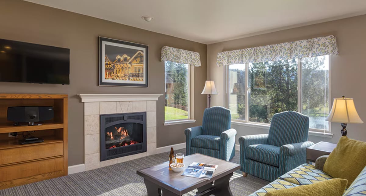 Step outside onto the deck of the Colorado suite to enjoy an outdoor table with seating. The living room and den are equipped with comfortable couches and chairs, offering an unbeatable view of the Wenatchee River. Cozy up by the gas fireplace, which adds a touch of ambiance to any occasion. Designed primarily for couples’ getaways, the Suite features a full kitchen, 2 bathrooms and large deck.
