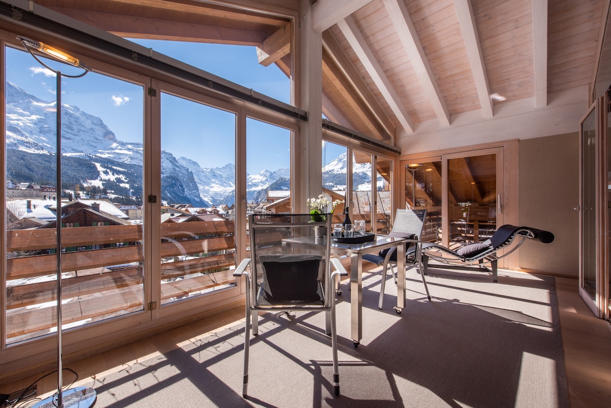 Spacious & bright ground floor apartment. Ski-in, ski-out. Quiet neighborhood, open floor plan, one bedroom, large garden terrace & stunning mountain views. King bed (180cm x 200cm), full kitchen, Nespresso coffee machine & coffee pods, electric tea kettle & tea. Bicycle & winter gear storage in cellar. Hike-in, hike-out or bike-in, bike-out in the summer. Suitable for max. 4 people. Located in the the same chalet as our "Modern Wengen Studio" and a short walk from the Wengen train station.