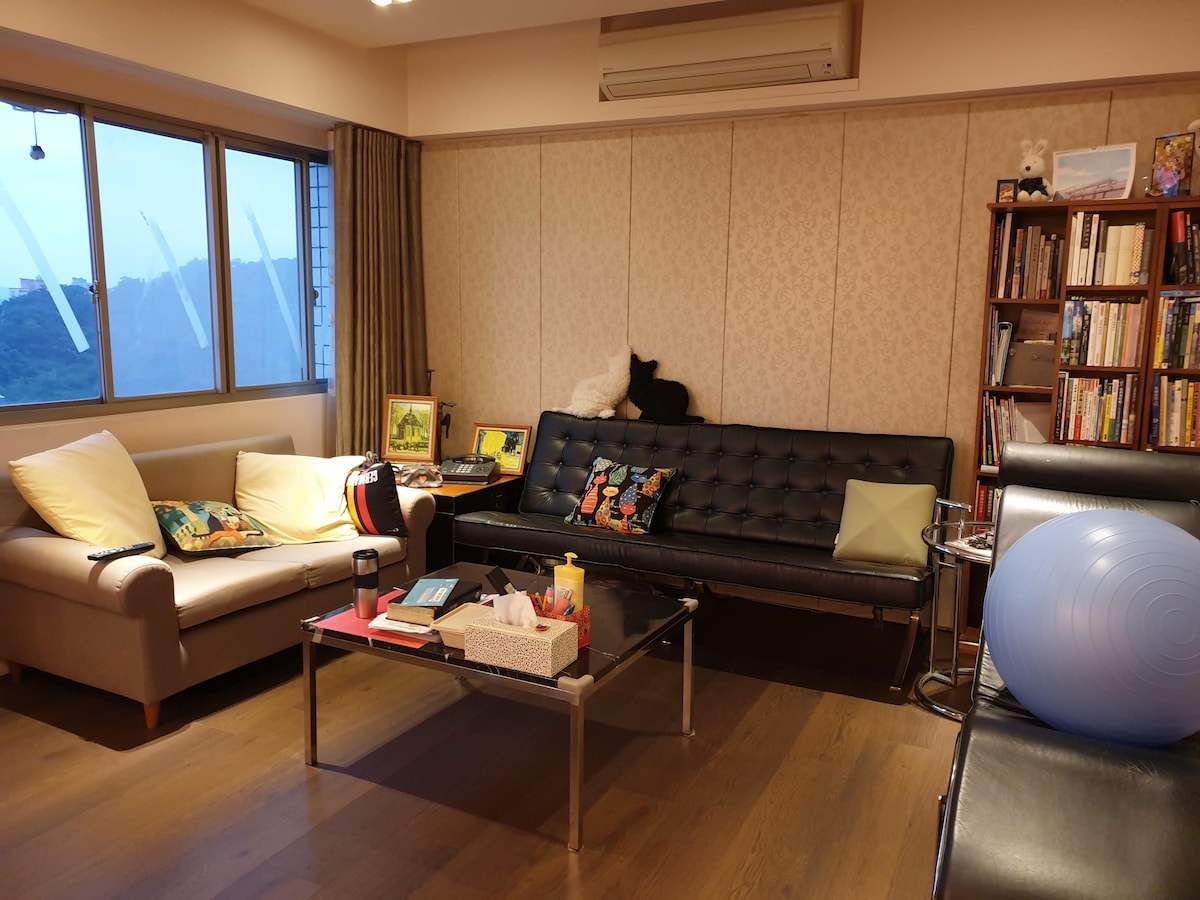 這是整層住家裡的一間雙人套房,需與屋主同住,我們是家庭式公寓,屋子裡有三個房間,房客會住在有獨立衛浴(提供衛生紙、洗髮精、沐浴乳)的套房。 近師大分部(走路一分鐘)、公館商圈及捷運站(走路15分鐘)、捷運萬隆站(走路15分鐘)。 P.S. 有一隻親人的黑貓會在公共空間活動,可能會有貓毛,若您會過敏請不要預定;但他不會進入您的房間,請不用擔心。 This is a house-sharing room, near NTNU Gongguan Campus, Gongguan night market, and MRT station, MRT Wanlong station. P.S. There's a cat in the house, if you are allergic to cat fur, this room is not suitable for you; and the cat won't get in the room, don't worry.