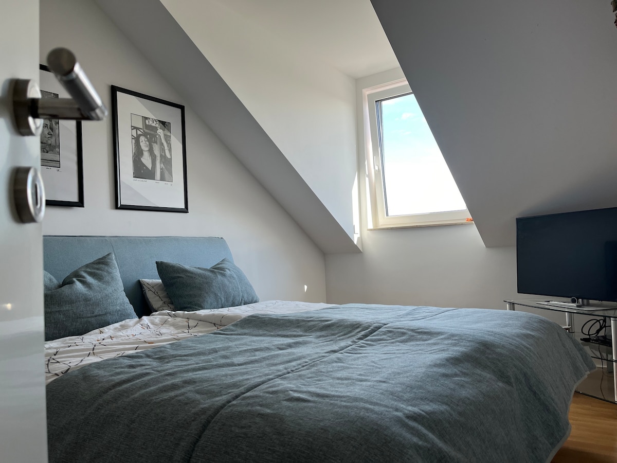 Dachgeschoss Wohnung 20 Autominuten von Potsdam und Berlin und 30 Zugminuten vom BER entfernt. Großzügige, vollausgestattete Designküche*, Badezimmer mit Agape Vieques Badewanne und passendem Waschbecken * , Schlafzimmer mit 2,70m großem Bett * , Fitnessraum kann als zweiter Schlafbereich genutzt werden. Hier ist ein 1,80m Doppelbett*Beamer mit App Vorinstallation für NETFLIX, Disney + und Amazon Prime Login, Spielsachen, Supermarkt mit Bäcker und Fleischer Getränkemarkt*Badeseen&Wandern