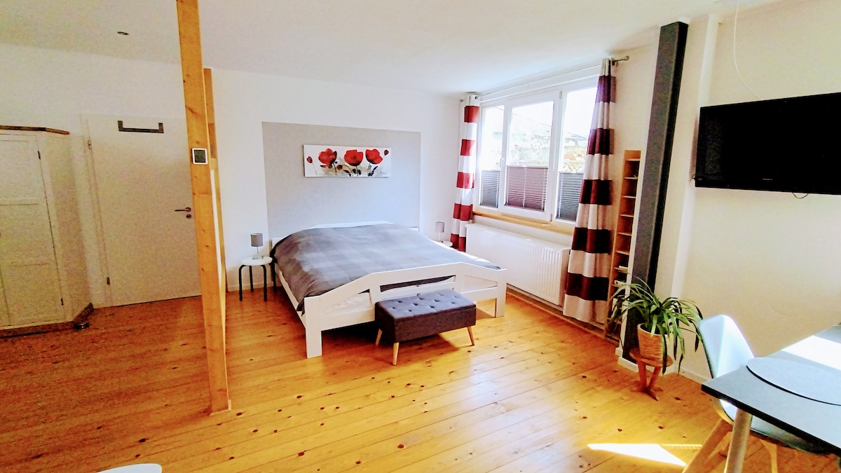 Die 1-Zimmer-Wohnung befindet sich im Erdgeschoss und verfügt über einen separaten Eingang. Ein Parkplatz für unsere Gäste steht vor dem Haus zur Verfügung. Die Wohnung ist komplett ebenerdig, nahezu Barriere frei und für Alleinreisende oder Paare gut geeignet. Vor der Wohnung gibt es einen kleinen Sitzplatz im Freien, der ausschließlich den Gästen zur Verfügung steht.