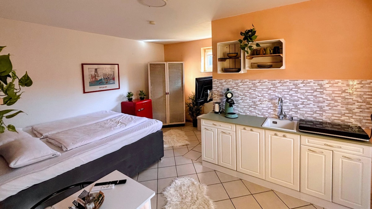 Das 40 m² große 1-Zimmer Apartment mit eigenem Eingang befindet sich in ruhiger Lage im Stadtteil Hannover-Davenstedt. Die lichtdurchflutete Wohnung bietet ein komfortables Doppelbett, eine Sitzecke mit Kabel-TV, eine gut ausgestattete Küchenzeile mit Esstisch und zwei Stühlen, sowie ein Bad mit Dusche. Die Fahrzeit mit öffentlichen Verkehrsmitteln beträgt ca. 30min bis zum Hauptbahnhof und ca. 60 min bis zum Messegelände.
