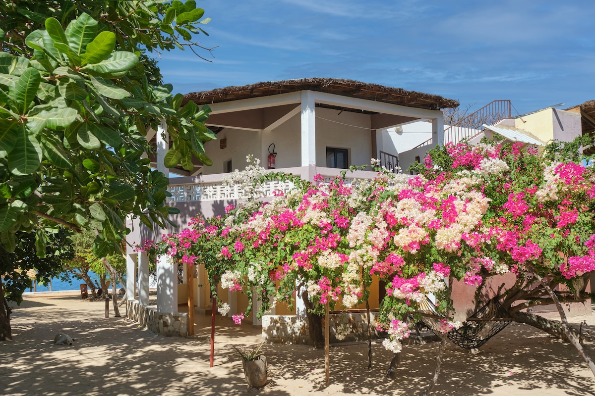 Palmarin, village authentique au cœur du Sine Saloum. La maison se situe à quelques centaines de mètres du village dans un jardin arboré de 3500 m2, au bord de l'océan et à la limite de la réserve naturelle communautaire. La chambre est située face à l océan , au bout du jardin. Chambre avec salle d'eau (douche eau chaude, lavabo, wc). lit 2 personnes avec moustiquaire, armoire, bureau. ventilateur. Possibilité d' un lit supplementaire d'1 personne . La piscine pour vous rafraîchir!
