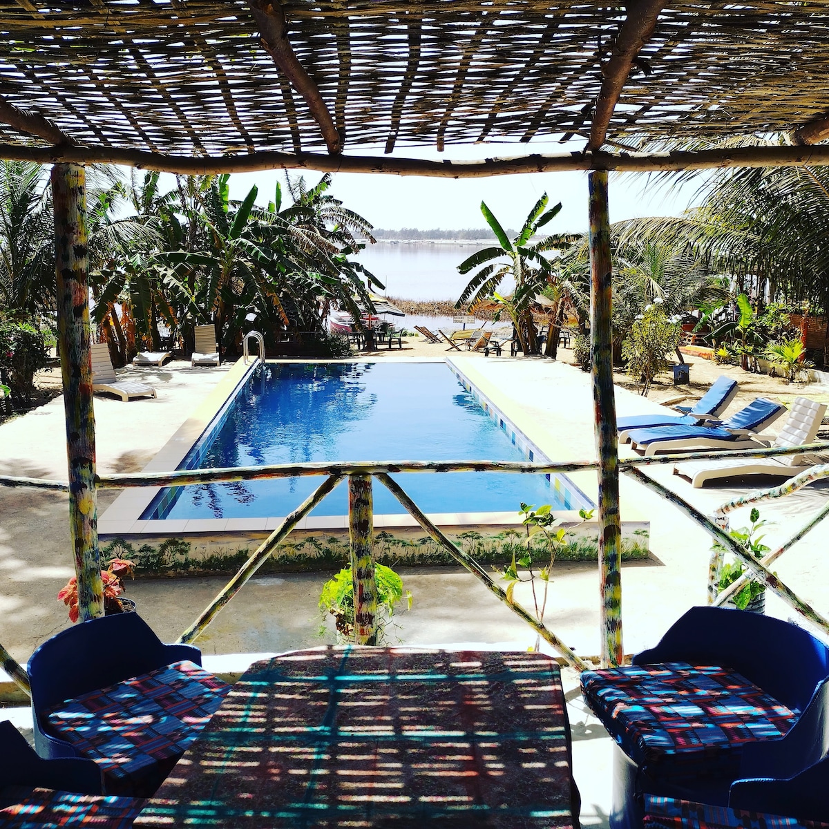 Palmarin, village authentique au cœur du Sine Saloum. La maison se situe à quelques centaines de mètres du village dans un jardin arboré de 3500 m2, au bord de l'océan et à la limite de la réserve naturelle communautaire. La chambre est située face à l océan , au bout du jardin. Chambre avec salle d'eau (douche eau chaude, lavabo, wc). lit 2 personnes avec moustiquaire, armoire, bureau. ventilateur. Possibilité d' un lit supplementaire d'1 personne . La piscine pour vous rafraîchir!