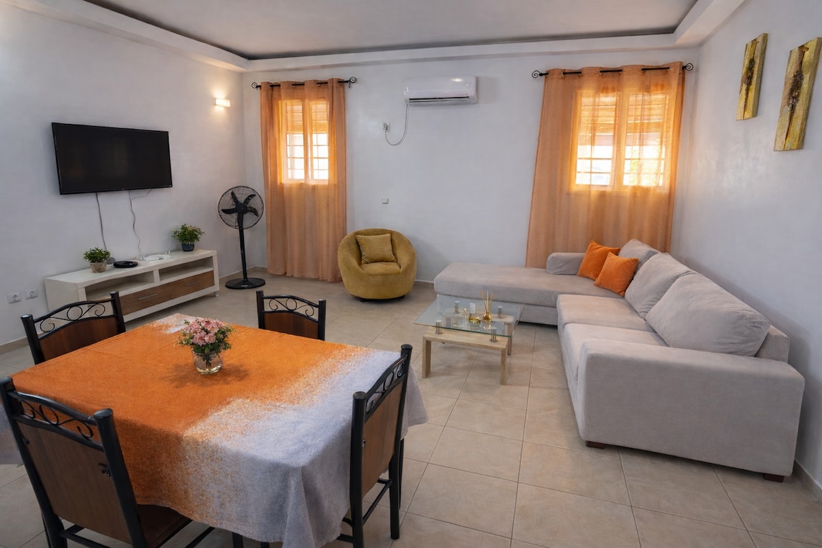 Salon spacieux avec 2 salles d'eau, 2 toilettes, cuisine équipée, 1 lit double, IPTV et Wi-Fi inclut ! Ce salon est parfait pour comme espace de détente et de travail. L’appartement offre : Deux salles d'eau pour plus de practicité. Une cuisine entièrement équipée pour préparer et savourer vos repas sur place. Wi-Fi haut débit inclus pour une connectivité optimale, de vos moments de détente et de divertissement. Un espace complet et confortable à ne pas manquer !