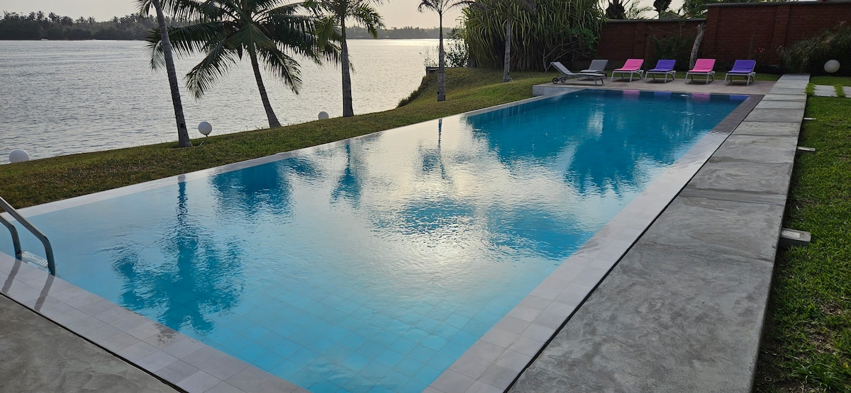 Cette villa équipée de trois chambres avec matelas qualité hôtel et trois salles de bain, d'un salon et d'une cuisine américaine, vous offre une vue imprenable sur le plan lagunaire d'Assinie mais aussi un cadre idyllique pour le repos et la tranquillité. Vous serez également enchantés par la piscine à débordement et la proximité de la villa avec la "passe" (embouchure entre la lagune et la mer), l'accès au côté mer en quelques minutes en pirogue et de nombreux restaurants et beach clubs.
