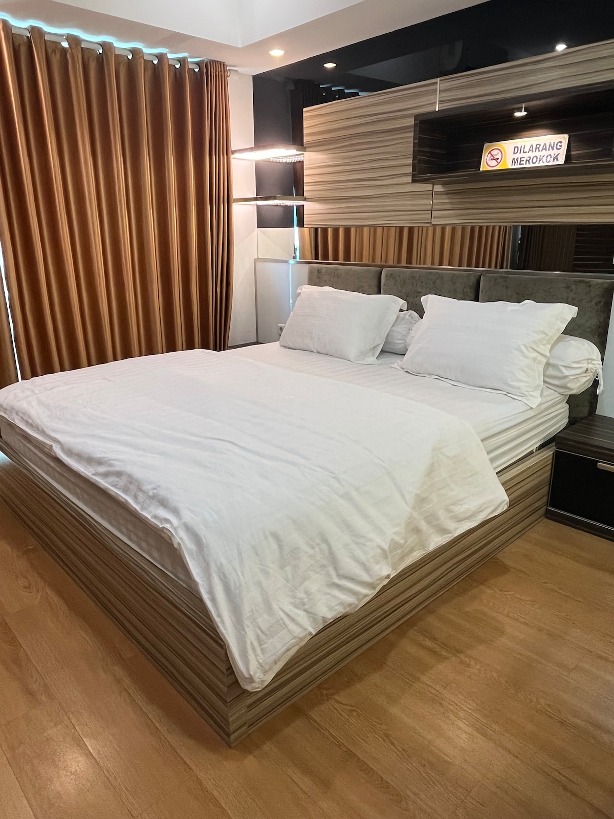 Welcome to our cozy 35m² studio at Dago Suites Apartment Bandung Located on the 11th floor, you'll enjoy stunning city views right from your balcony The studio offers a luxurious King Koil bed, and two additional floor mattresses, perfect for up to 4 guests Stay entertained with our 55-inch 4K Smart TV, complete with Netflix, Disney+, HBO Max, IQIYI, and Viu. Stay connected with fast 20Mbps WiFi. Kindly note that parking —both for motorcycles and cars— is cashless only