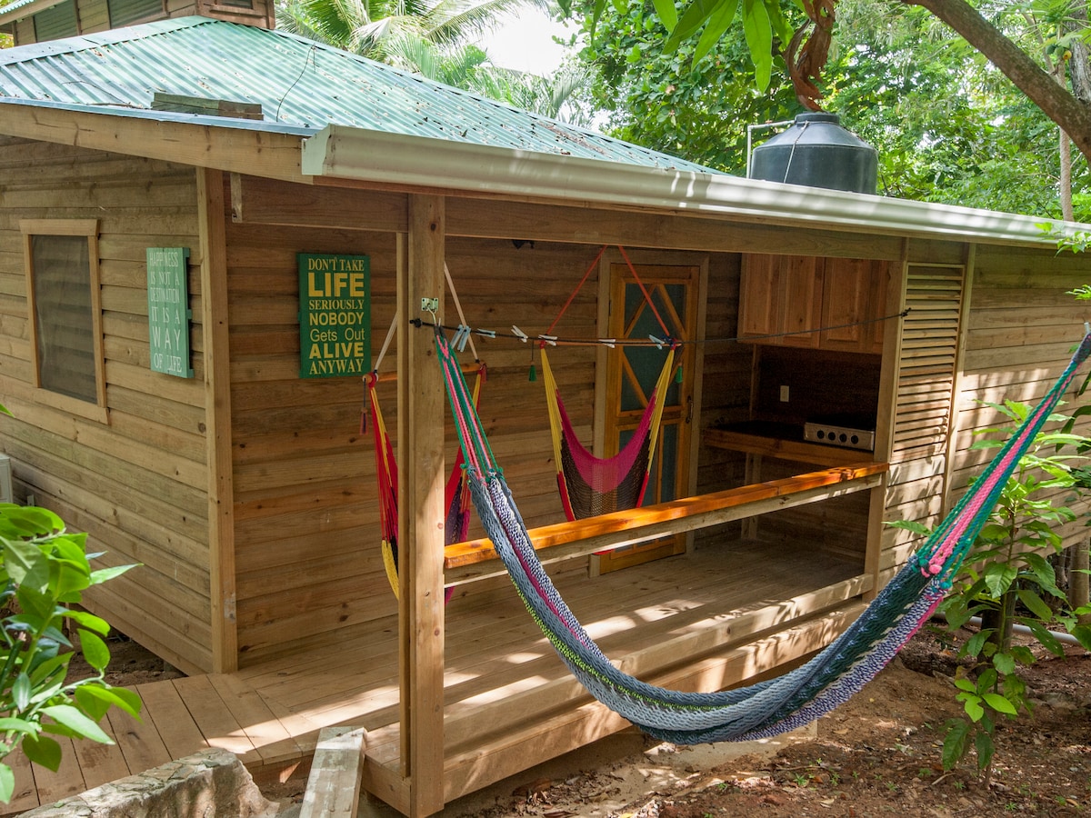 The Crabby Cabin is a beautiful cabin for 2. It has a screened in porch for enjoying your morning coffee and listening to the ocean. It has a fully appointed stainless steel kitchen and private stone bath. It features a queen bed, A/C, Wi-Fi and a Smart TV. It is one building back from the beach so within approximately 35 steps your toes hit the beautiful sand. This is our smallest island style villa on the property at 13x16 - 205 sq. ft.