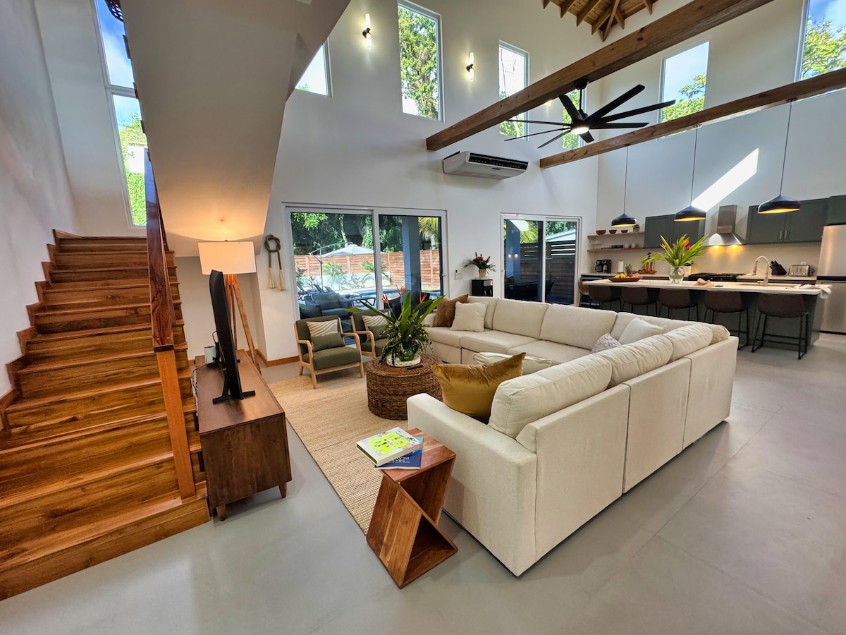 Located pool side this amazing space is a large open concept with vaulted ceilings. The suite has a queen size bed and a well-appointed bathroom. It features a full kitchen with all you’ll need for your stay. It has a spacious livingroom area, and a separate dining area. Spend your day at our infinity pool and hot tub surrounded by tropical forest and landscaping, just steps from the beach. . There are two 5 star restaurants directly below us on the beach for your dining convenience