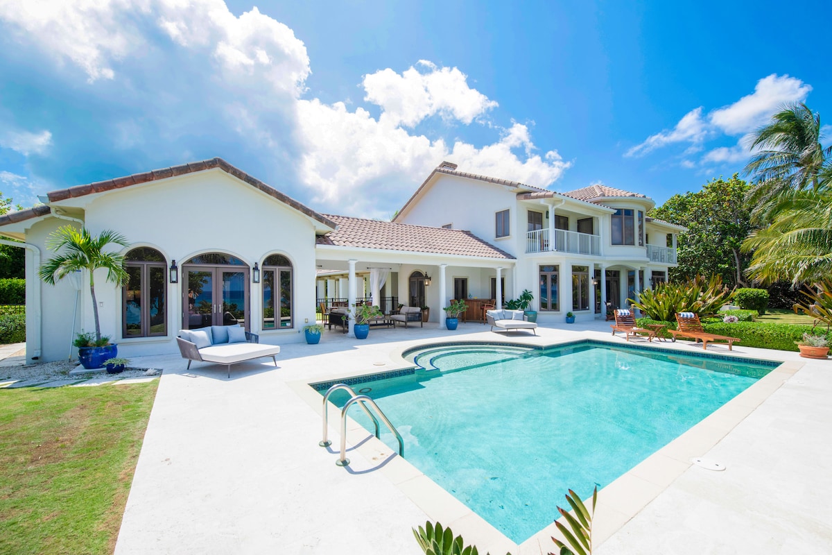 A six-bedroom, Balinese-style ocean estate in West Bay, situated next to Barkers National Park, offering a private micro-resort vibe. Enjoy an expansive pool deck with a swim-up bar, a heated spa, and a private beach, making it suitable for large families seeking luxury and privacy.