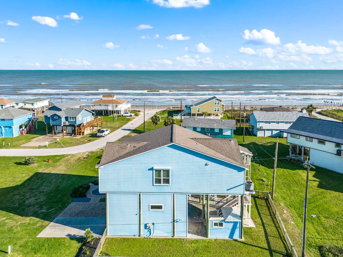 Hasta La Vista! Kick back and relax in this calm, stylish beachside home. Sit out on the deck with your coffee and listen to the songs of the shorebirds and soothing lull of the ocean. Grill up some good times on ground level. Have a delicious cocktail on the patio while playing cornhole. Make sweet s'mores at the fire pit. Take a quick 3-5 minute 1-block walk to the beach without having to dodge traffic or cross a major street. Enjoy all the history and charm of Galveston Island!