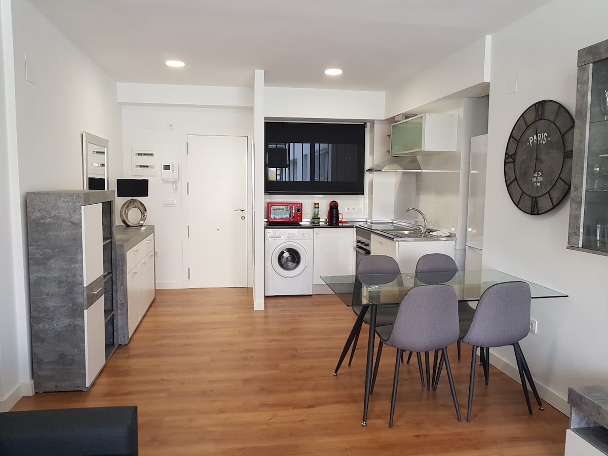 Apartamento a estrenar, totalmente reformado. Decoración con estilo, paredes de hormigón y pintura blanca lisa, armarios de hierro con cristales antiguos, mesas de maderas antiguas recicladas, sofas de lino, cocina de microcemento, con lavavajillas, horno, microondas, lavadora, secadora... Luz ambiente y cálida