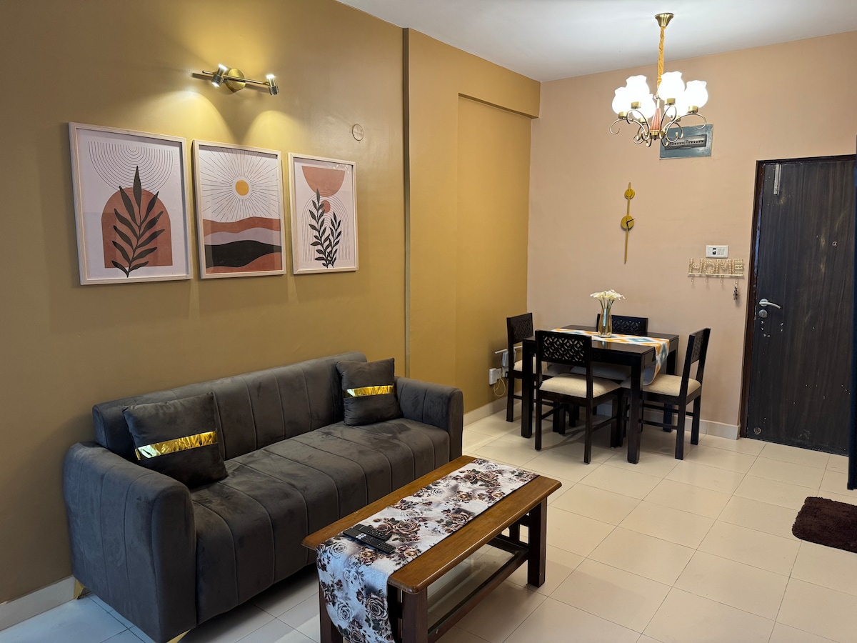 Welcome to your comfortable home in Greenfield City, Behala. This spacious 2BHK apartment is perfect for families, couples, and business travelers looking for a relaxed and well-connected stay. Both bedrooms are fully air-conditioned, ensuring a comfortable sleep after a long day. The living room features a large 50-inch Smart TV, a comfortable sofa, and a warm, inviting setup to unwind or enjoy your favorite shows. A dedicated dining table makes it easy to enjoy meals together.