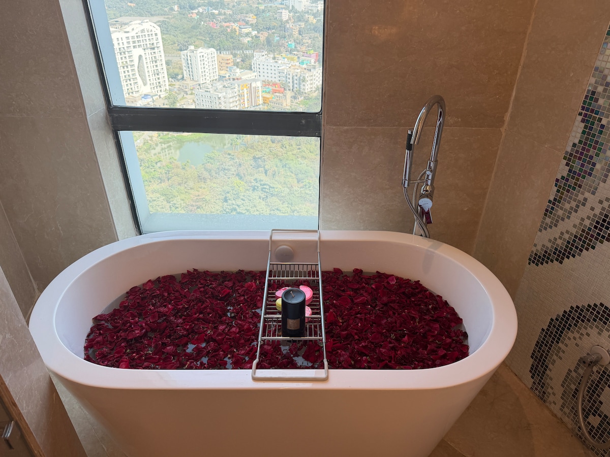 Hi-Floor with Awesome Panoramic View of City from Large Glass Windows & Balcony. Situated on EM Bypass, it is a perfect Getaway. Fully separate - 2 AC Bedrooms for 4 People & a AC Drawing cum Dining + a Modern Kitchen and two WC toilets with Geyser. Washing Machine/Gas/Oven/Microwave/Mixie/ Kettle all provided. Gated Community with 24*7 Security by GS4, highly secured place where you feel like in a Fortress of Protection. Free RO Water. Free 100 MBPS Jio fibre WiFi. Metro Station is 5 mins walk.