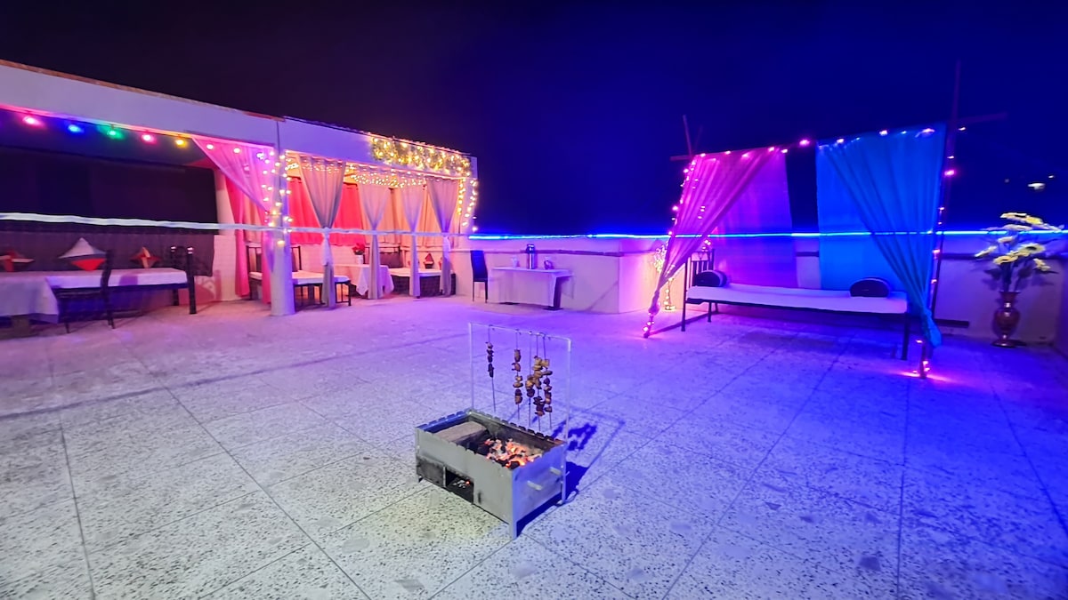 It offers a variety of experiences depending on how u want to enjoy ur evening. Chill out with ur friends at Cabana&Gazebo or exclusive Tipi tent for couple &other open area for games&Fun. The place is set up &decorated with shamianas &bed with mattress arranged for a perfect seating &sleeping under a sort of a indoor gazebo, &some outdoor as well. The place is perfect for those who want a chilled out &lazy vibe while puffing on a hookah &eating hot BBQ right in the bed that you are lounging on
