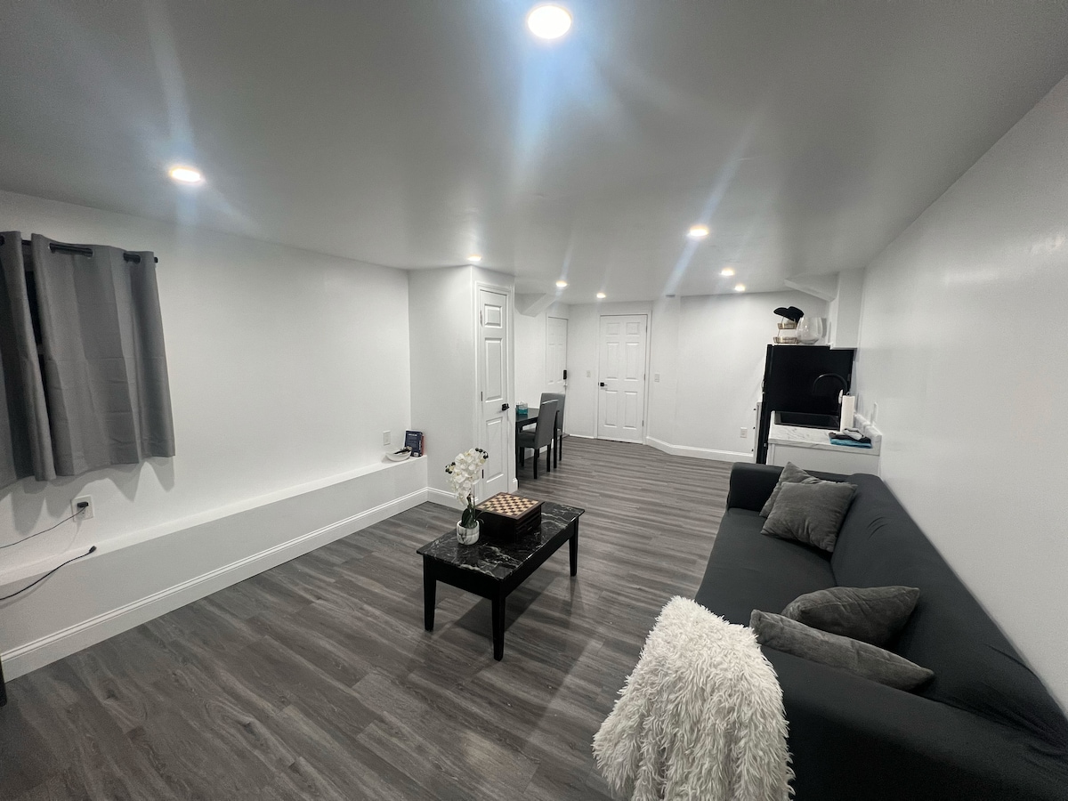 The suite allows maximum of two pets per reservation for $50 per a pet. Our guests privacy starts from check in to check out with private entrance. The living room has mini library for guests, a 65 inch smart TV with high speed Internet and complimentary YouTubeTV local channels. The suite has a mini kitchen with mini refrigerator, freezer, microwave, air fryer, and coffee maker. It also has stocked cabinet utensils, cleaning supplies, linen closet and electric pump air mattress if necessary.