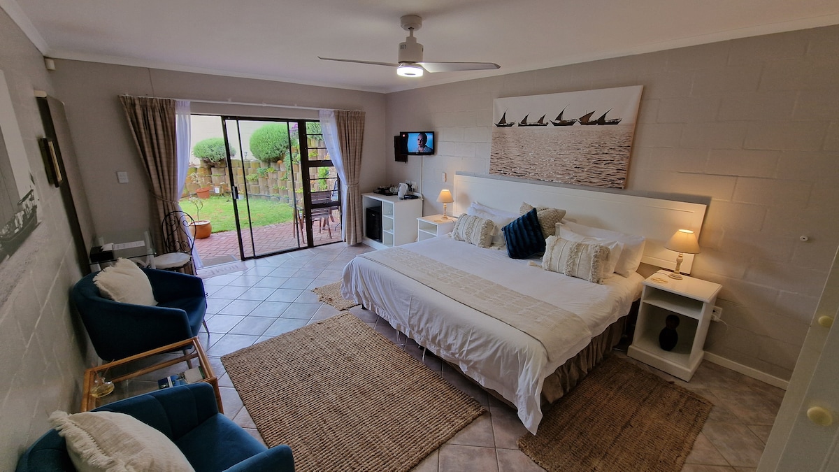 Luxurious room with king-size bed or two single beds (by prior arrangement), an en-suite shower, heated towel rail, bar fridge, tea and coffee-making facilities, and DStv commercial package. Sea view from mini kitchen next to bedroom and if required a private barbeque area downstairs.