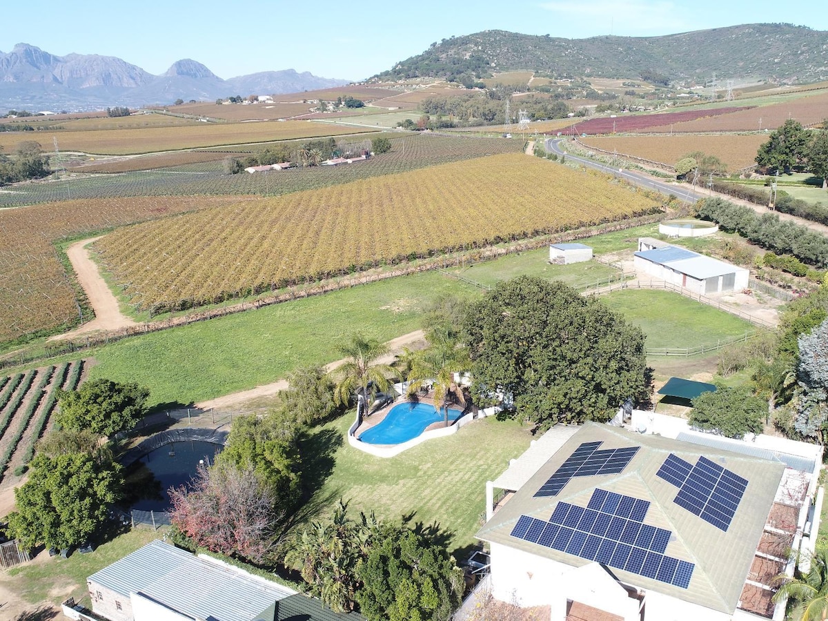 #Bainsbosch A spacious tranquil rustic cabin on the banks of the Wit River at the base of Bains Kloof Pass. The cabin is surrounded by 2 hectares of fynbos and the Limietberg mountains. There is a full kitchen and 3 bedrooms. Mount Bain is a protected nature reserve . The Wit River flows down Bains Kloof. Guests can swim in pristine mountain water, hike into the surrounding mountains or visit several Wine estates nearby.". Backup power is provided for loadshedding.