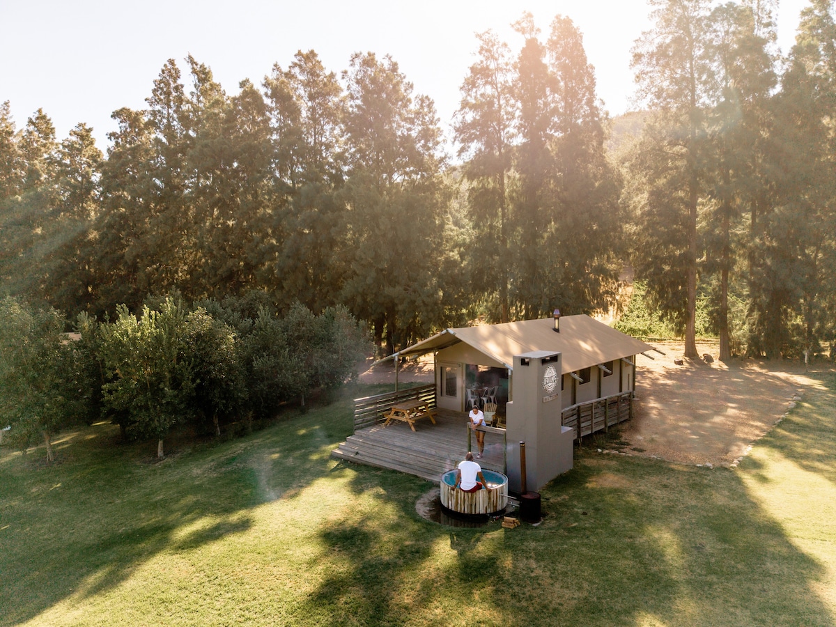 Self-catering AfriCamps boutique glamping tents are surrounded by breathtaking mountains and sweeping vineyards. Tents open onto a peaceful meadow, where the soothing sounds of the Kromme River fill the air. Each tent has a lounge, dining area, wooden deck, two bedrooms with queen-size beds, plus a single bunk bed in one, a bathroom, and a private outdoor wood-fired hot tub.