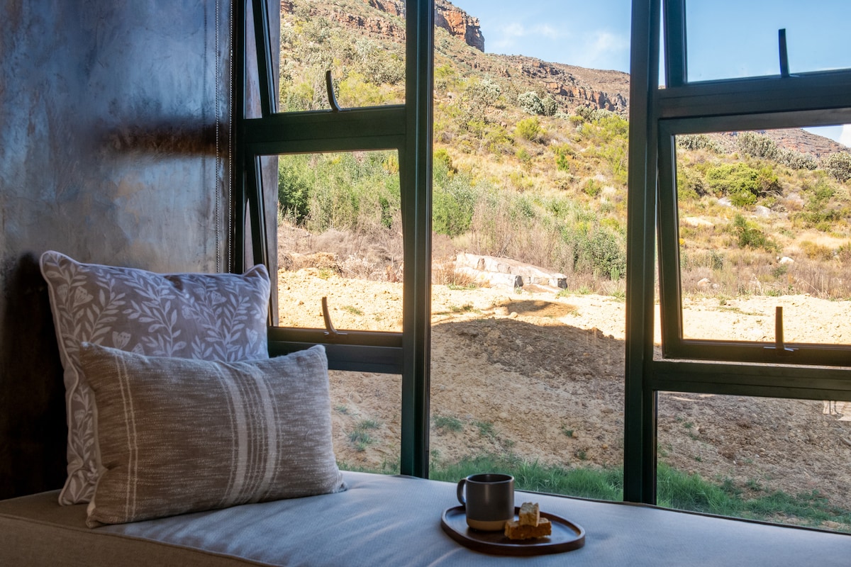 Deluxe Cottage 2 – Pink Lady with a kitchenette, en-suite shower, cosy reading nook, private stoep, and braai area. Choose between 2 twin beds or a king-sized bed. Set among orchards with mountain views — the perfect Koue Bokkeveld escape.