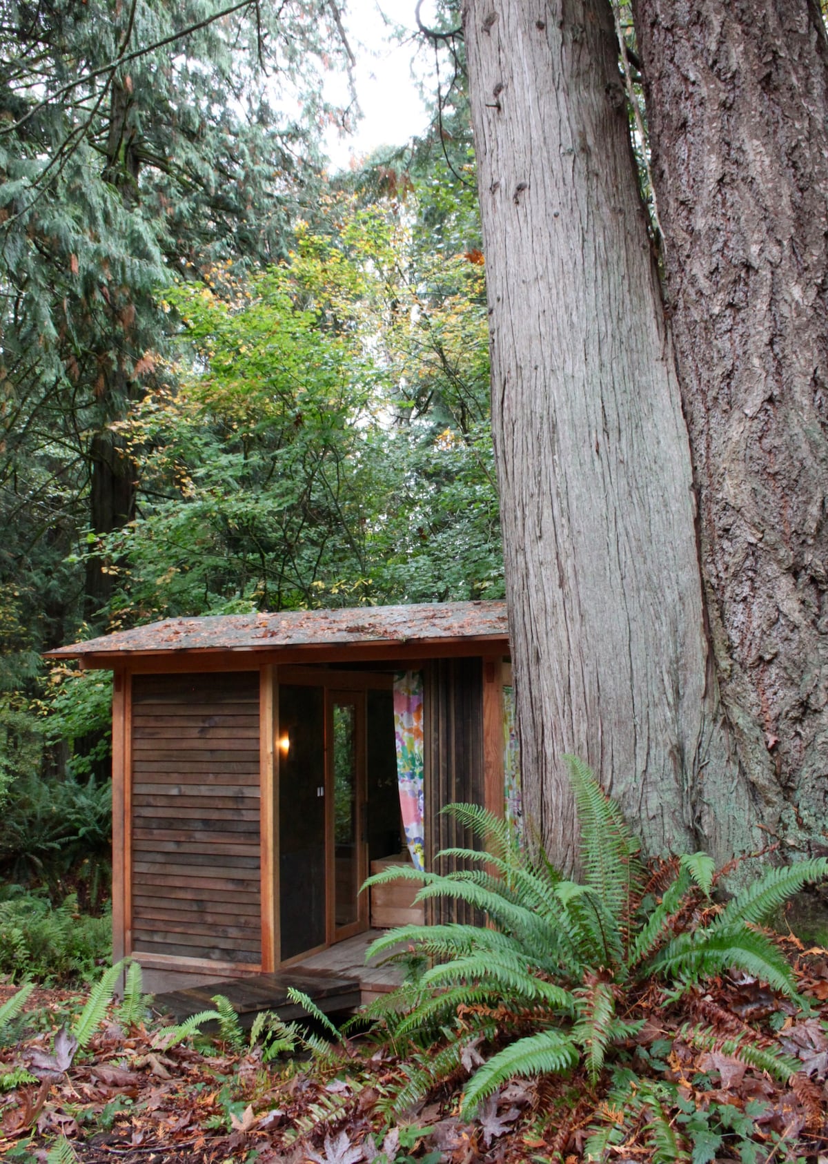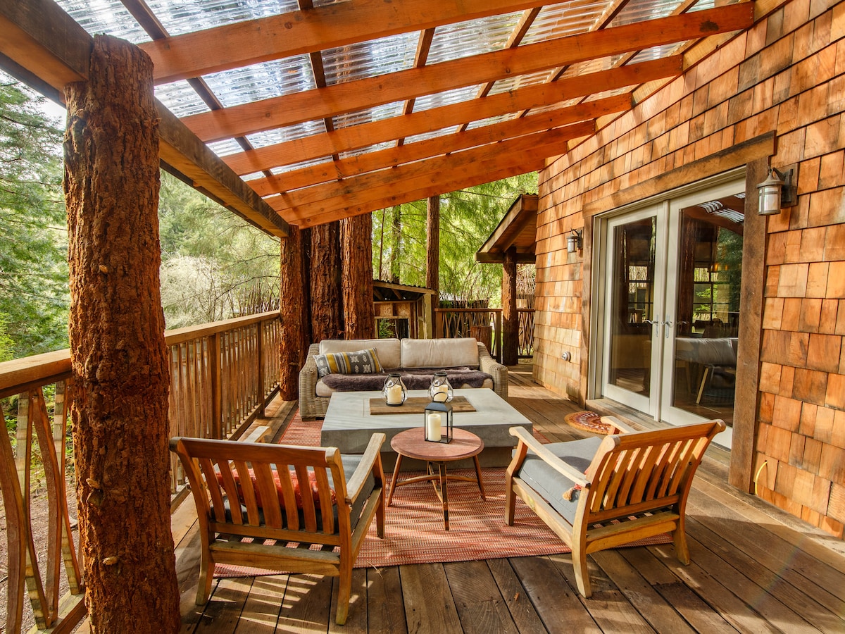 This incredible space has been the inspirational hub for designing the most creative projects in Humboldt during the past 18 years. Now it has been reborn as an immersive space to enjoy the redwoods. Every inch has been thoughtfully designed to allow our guests to feel the enveloping majestic nature of the surrounding forest. Upon arrival, a golf cart awaits for your journey through the woods, to the upper landing of the raised boardwalk crossing over a seasonal creek bringing you to The Studio.