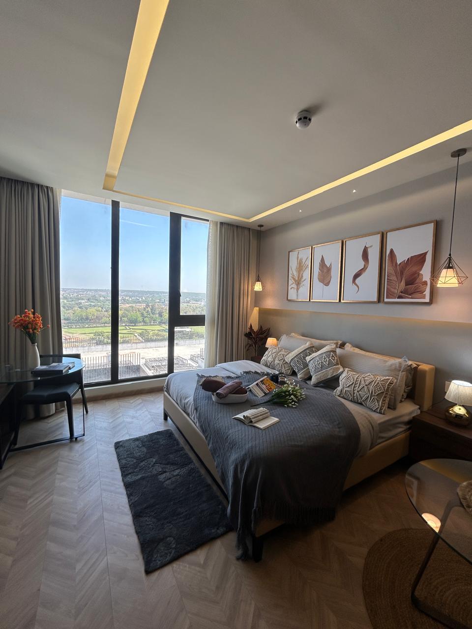 Welcome to this another beautiful and cozy property by Tulip Homes. It is situated on 16th floor & completely fresh apartment with garden patio which makes it unique in class. The place is perfect for relaxing and enjoying scenic view of modern architecture. Apartment is loaded with smart tv (all applications works), big mirror wall, a cozy double bed, big wardrobe with locker, 5 seater sofa, stylish nesting coffee tables, fridge, microwave, induction, electric kettle, toaster, iron & much more
