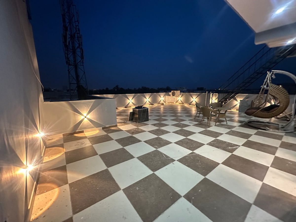 Insta - airbnb_gogo.homes Gogo Homes Kimika is the perfect retreat to recharge and relax. Enjoy a stay featuring a soothing nozzled live Jacuzzi, ideal for unwinding. After your soak, take in the stunning views of Gurgaon’s skyscrapers from our terrace garden, with delicious bites from nearby award winning restaurants Located in the upscale Sector 27 of Gurugram! Price mentioned is for 2pax. Although space is good enough to invite people for gatherings! Extra guests will be chargeableable