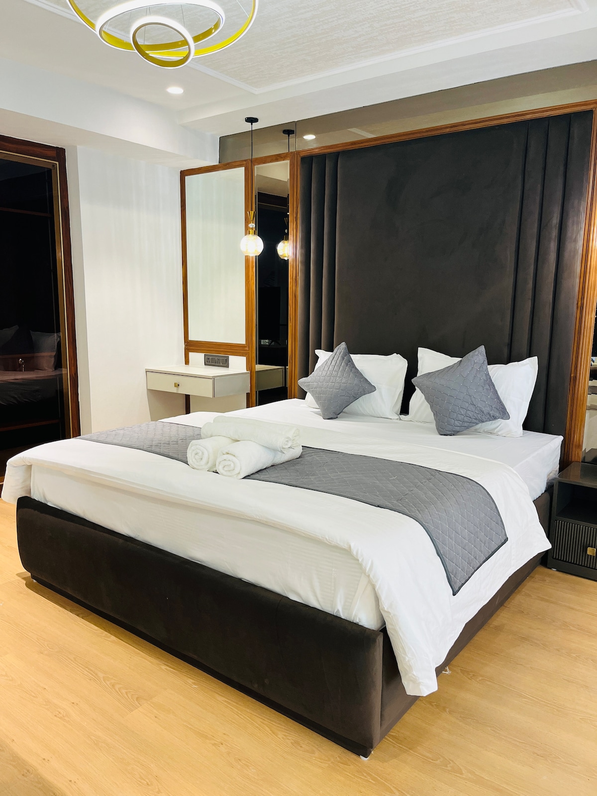 Welcome to this another luxurious property by Tulip Homes which is situated on 12th floor of a High-rise building. Wide garden patio & 2 seater jacuzzi makes it unique in class. The place is perfect for relaxing and enjoying scenic view of modern architecture. Apartment is loaded with smart tv (all applications works), big mirror wall, a cozy double bed, comfy swing, stylish couch with central nesting coffee tables, fridge, microwave, induction,electric kettle, toaster, iron & many more.