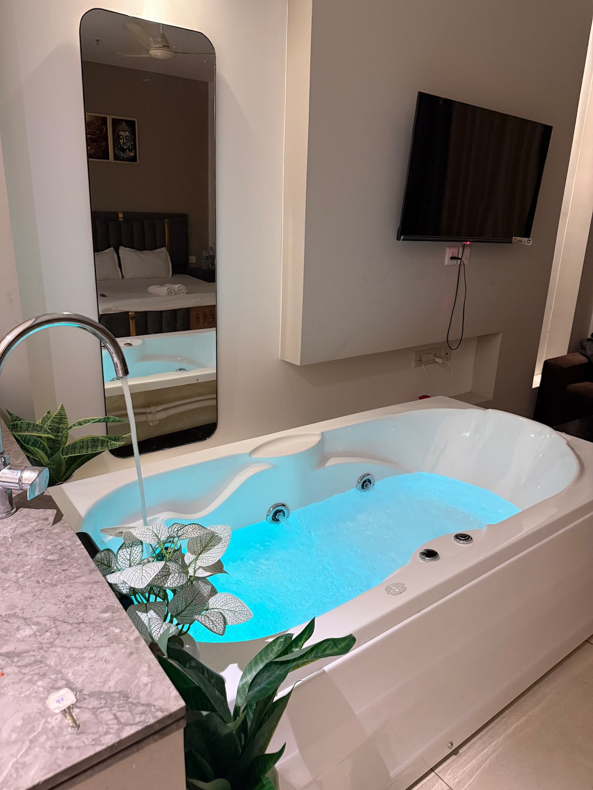 Insta - airbnb_gogo.homes Gogo Homes Kimika is the perfect retreat to recharge and relax. Enjoy a stay featuring a soothing nozzled live Jacuzzi, ideal for unwinding. After your soak, take in the stunning views of Gurgaon’s skyscrapers from our terrace garden, with delicious bites from nearby award winning restaurants Located in the upscale Sector 27 of Gurugram! Price mentioned is for 2pax. Although space is good enough to invite people for gatherings! Extra guests will be chargeableable